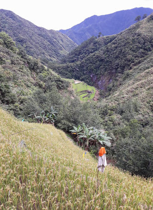 En cette deuxième journée de trek, nous quittons le cadre enchanteur de Pula pour rejoindre celui de BATAD, un autre village niché au cœur de ces montagnes de rizières et considéré comme le plus beau joyau de la région. Un des grands atouts de ce trek de 3 jours, c’est que l’on découvre pour la première fois Batad depuis les sommets, et la surprise est de taille ! De là-haut, on admire de petites maisons aux toits en tôle verts et rouges, disséminées dans la vallée et sur les reliefs. Mais surtout, un véritable amphithéâtre de rizières en terrasses, aux nuances de vert et de jaune, nous laisse bouche bée...